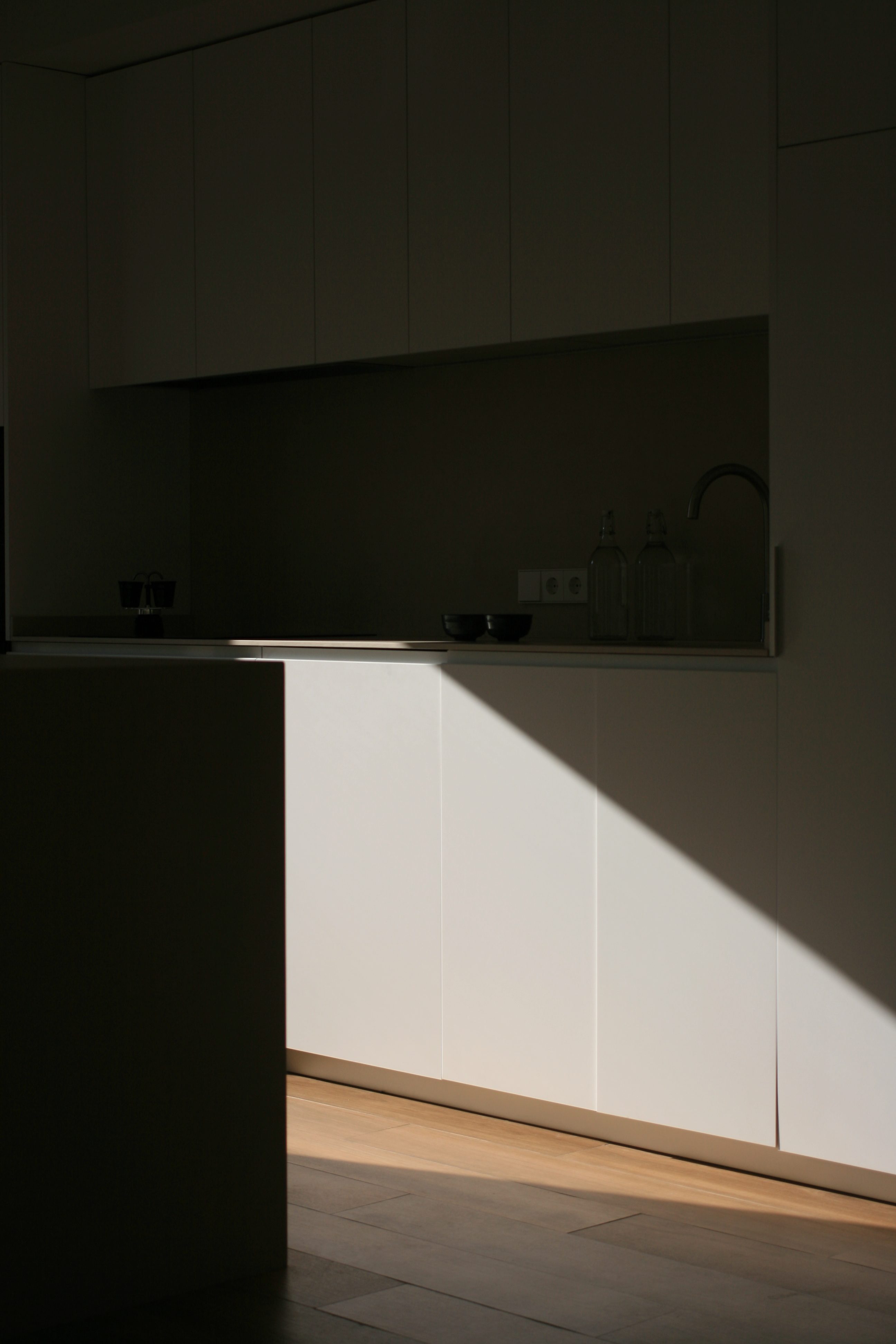 CASA 001 es la rehabilitación de una vivienda ubicada en un singular edificio de los años 50 en Valencia. El punto de partida del proyecto es el reconocimiento de una estructura de muro portante en todo su contorno y unas significativas vigas de hormigón en ambas direcciones. Consecuentemente, la organización de los espacios queda determinada por la métrica de los descuelgues del forjado. Esta estrategia se hace especialmente visible en el gran espacio de cocina, comedor, estar y acceso que, pese a estar abierto, queda formalmente organizado a través de su estructura.