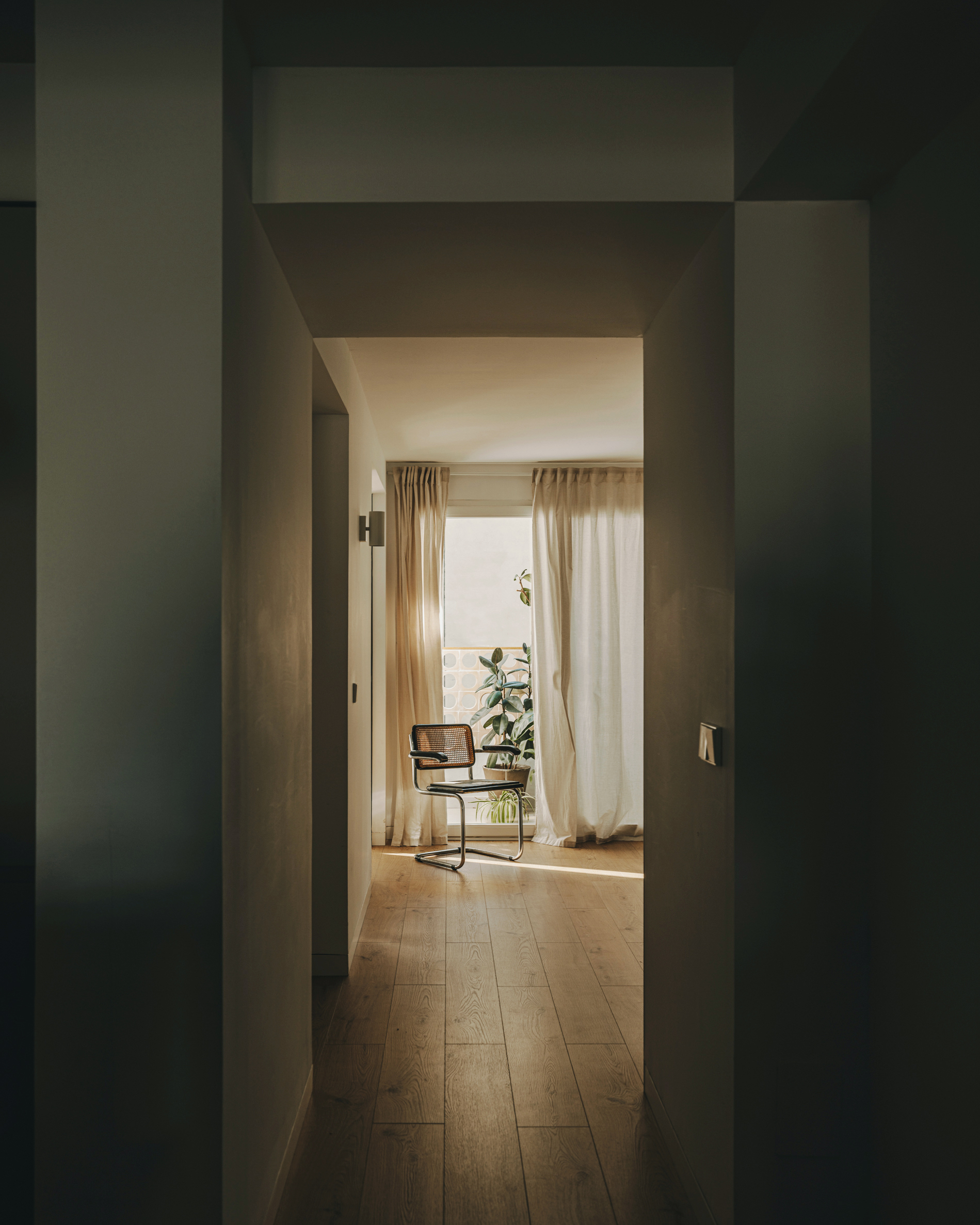 CASA 003 es la rehabilitación de un ático en Valencia donde la condición más restrictiva de la tipología se convierte en la estrategia del proyecto. Un largo recorrido en torno al patio interior quedaba inicialmente resuelto como un pasillo estrecho y oscuro, desde el acceso hasta la parte principal de la vivienda. En la propuesta, se busca romper ese esquema y disponer una serie de puntos de desahogo que articulen toda la planta.