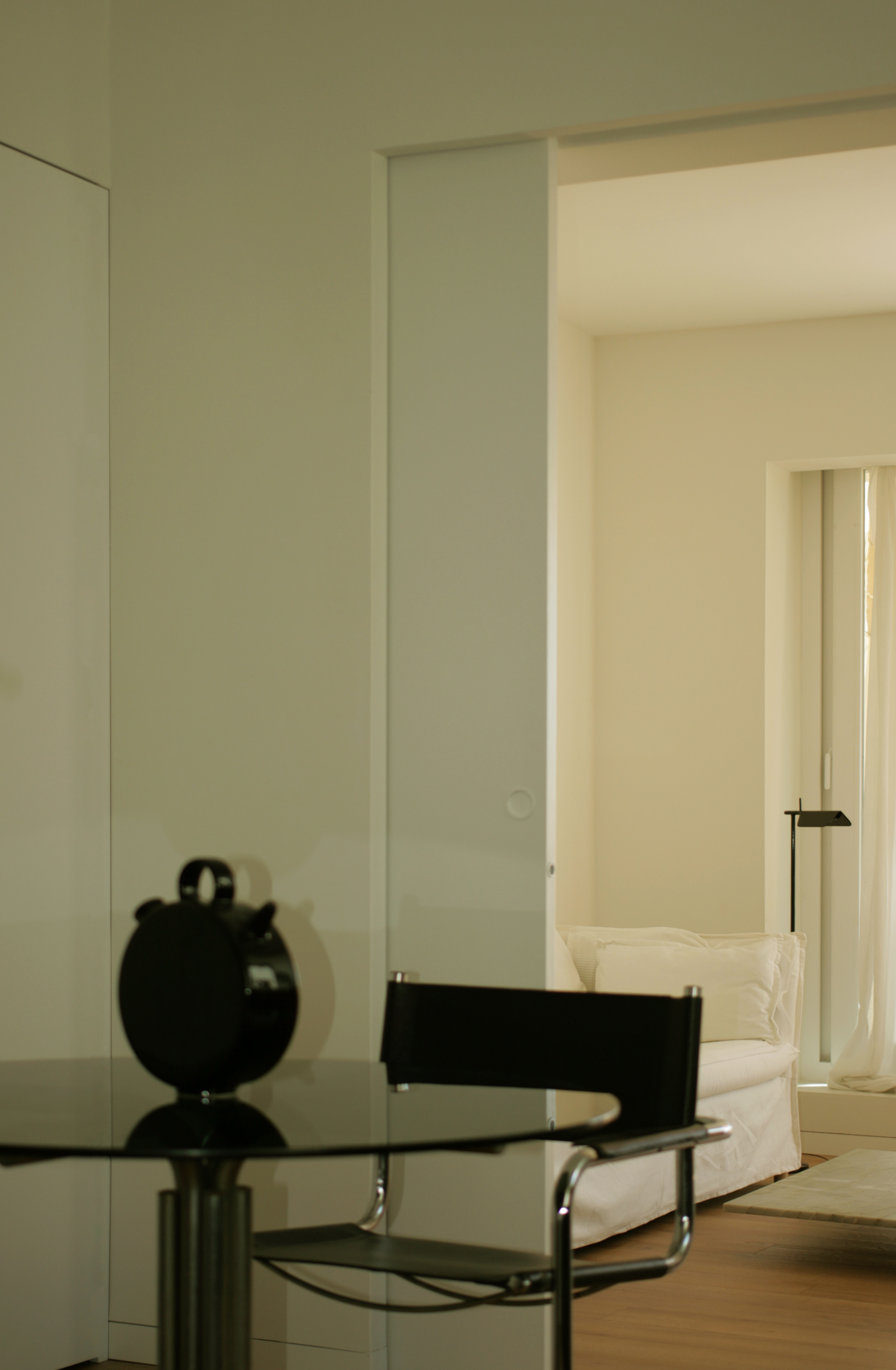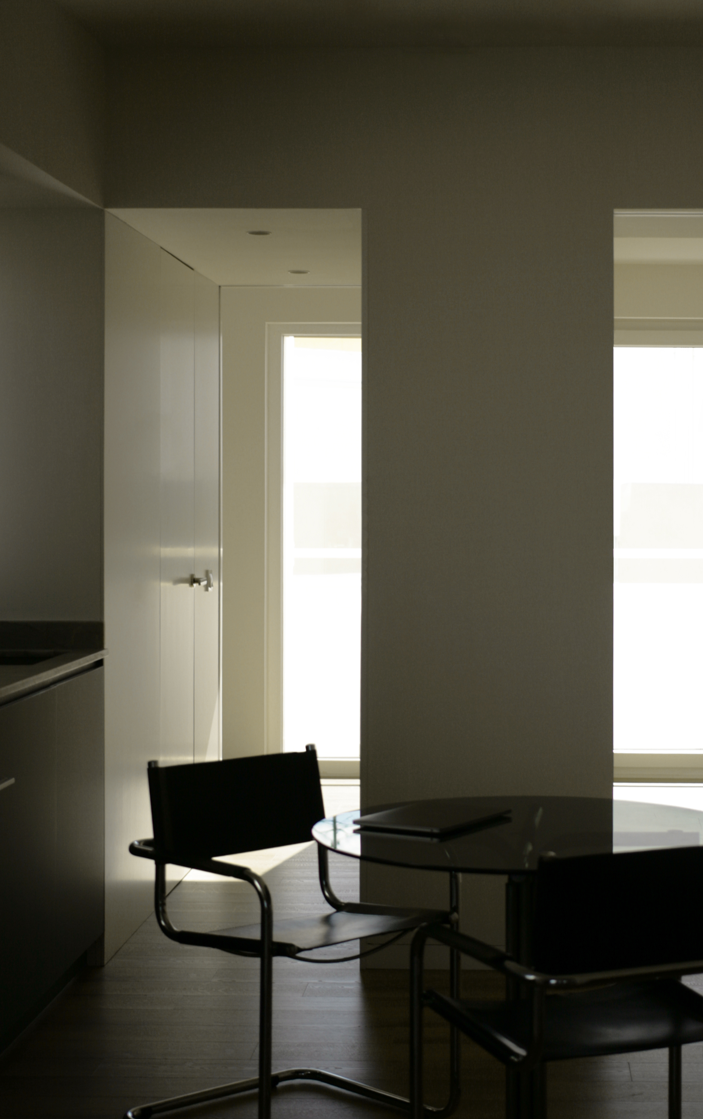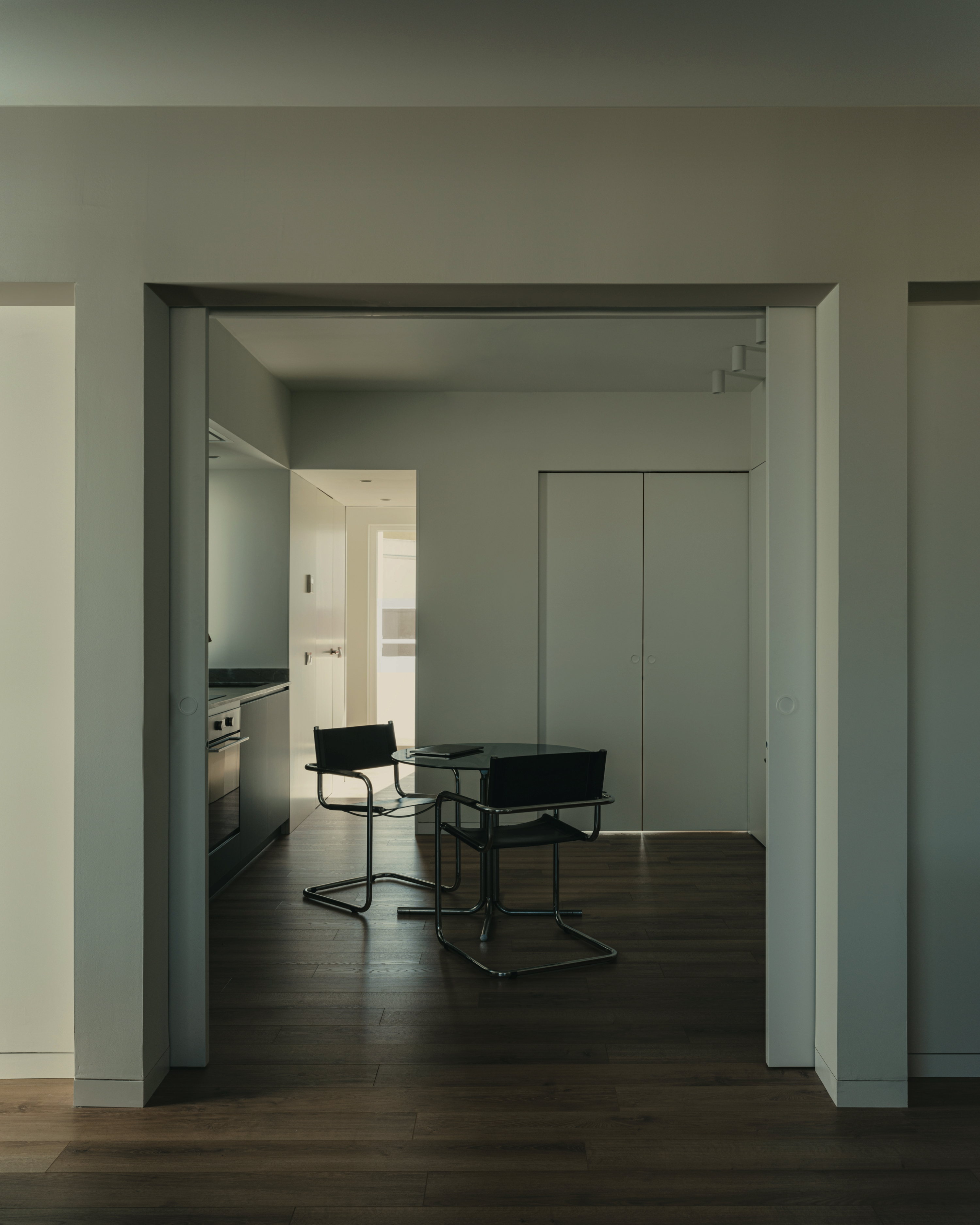 Los umbrales se significan con parejas de grandes puertas correderas, a modo de límites indeterminados con voluntad de aparecer o desaparecer por completo; haciendo funcionar el espacio como una unidad, o bien, seccionarlo en estancias independientes.