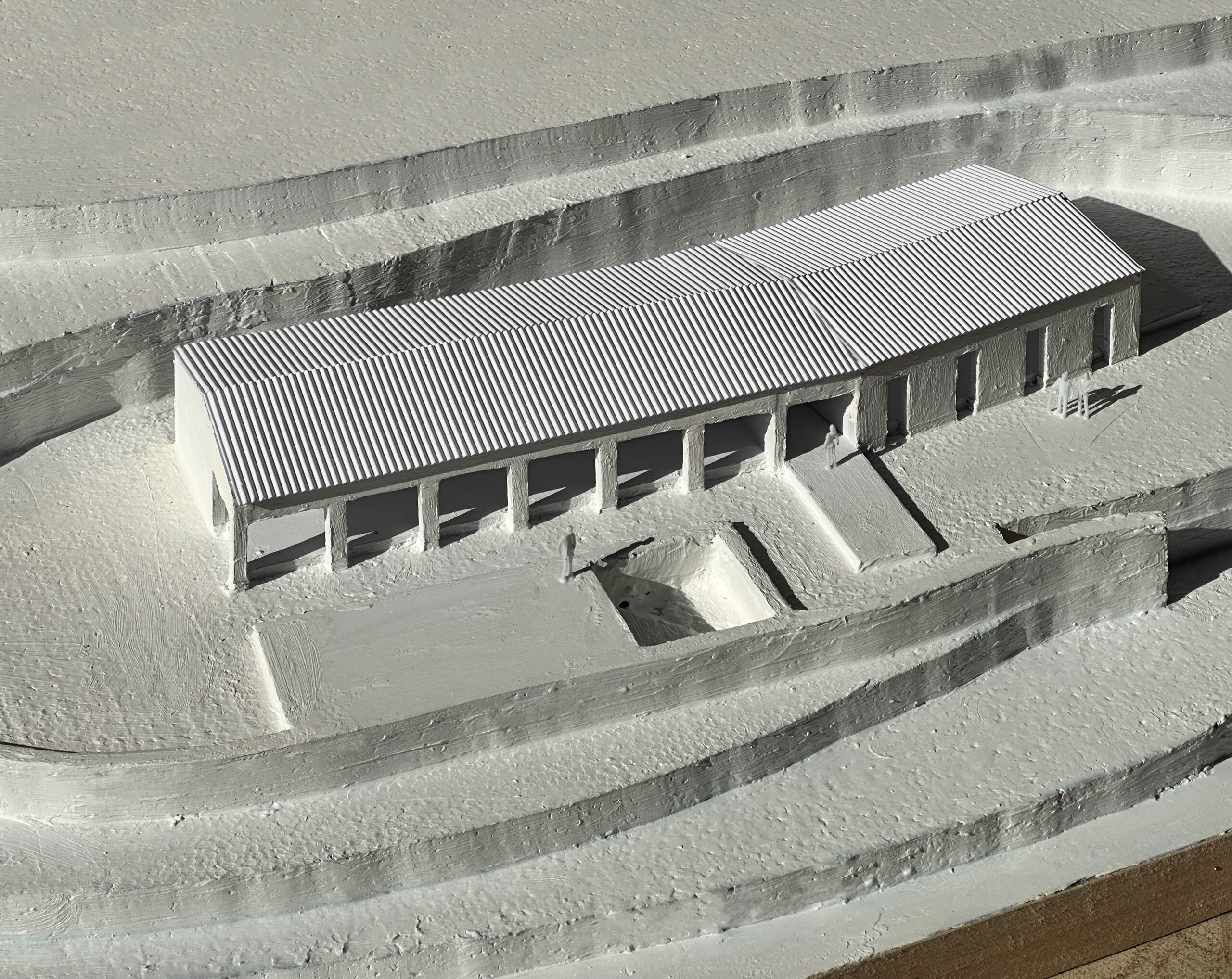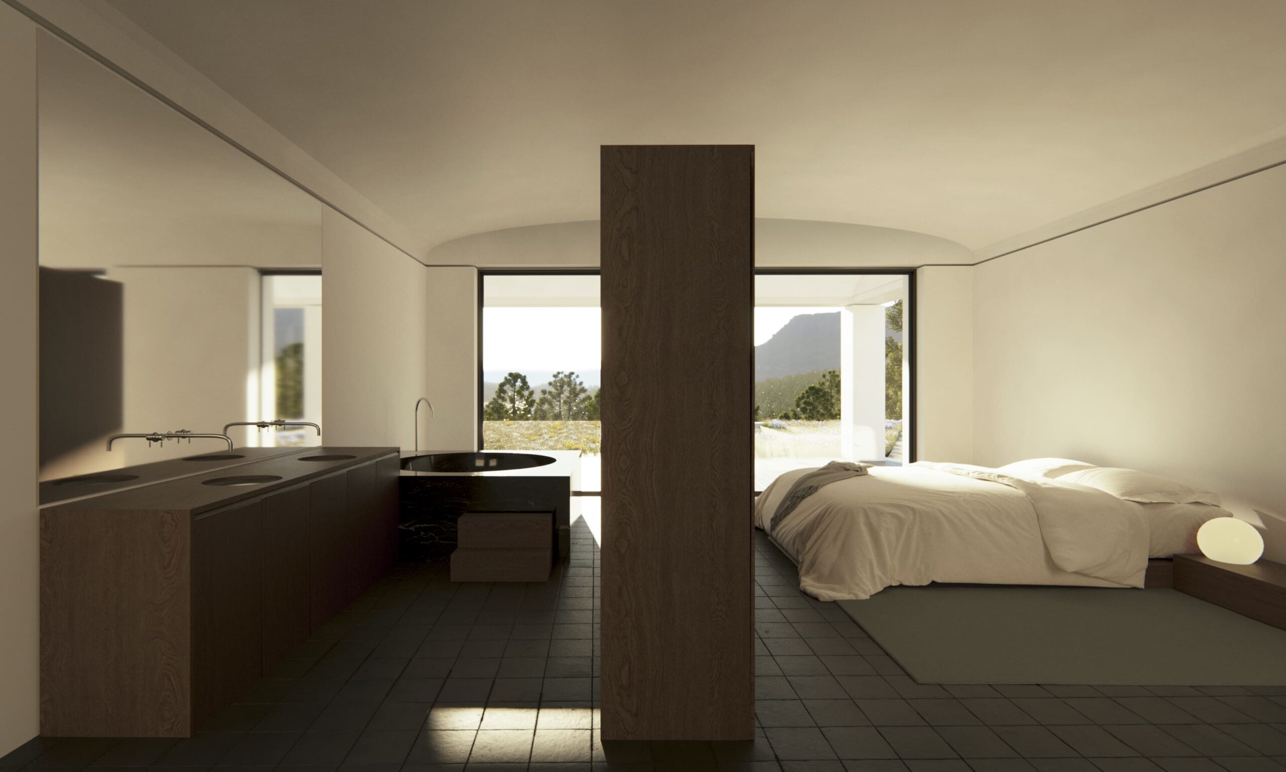 Se propone un sistema murario con huecos de ancho variable que orientan las vistas. La primera unidad, de mayor tamaño, alberga el dormitorio principal, el estar, el comedor, la cocina y un espacioso porche. Los huecos de esta pieza se gradúan en ancho, siendo más amplios hacia el porche, permitiendo una conexión fluida entre el interior y la terraza, la piscina y el mar.