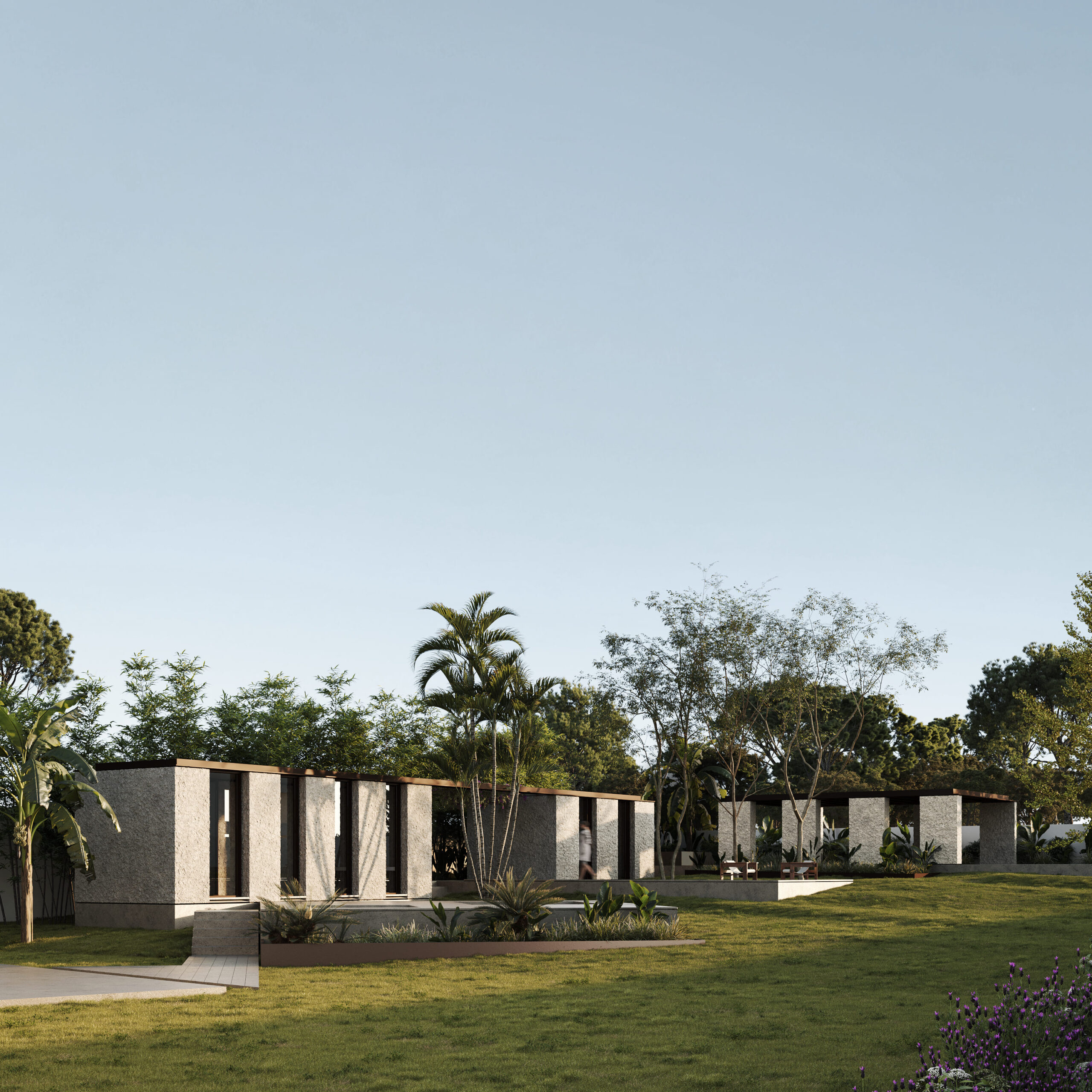 Sobre ellas, se construyen los volúmenes que acompañan el programa: una pareja de pabellones cerrados contiene la sauna, el aseo, el vestidor, el almacén y la cocina; mientras que el último, sobre la plataforma a mayor altura, se concibe como una gran pérgola cubierta para eventos familiares.