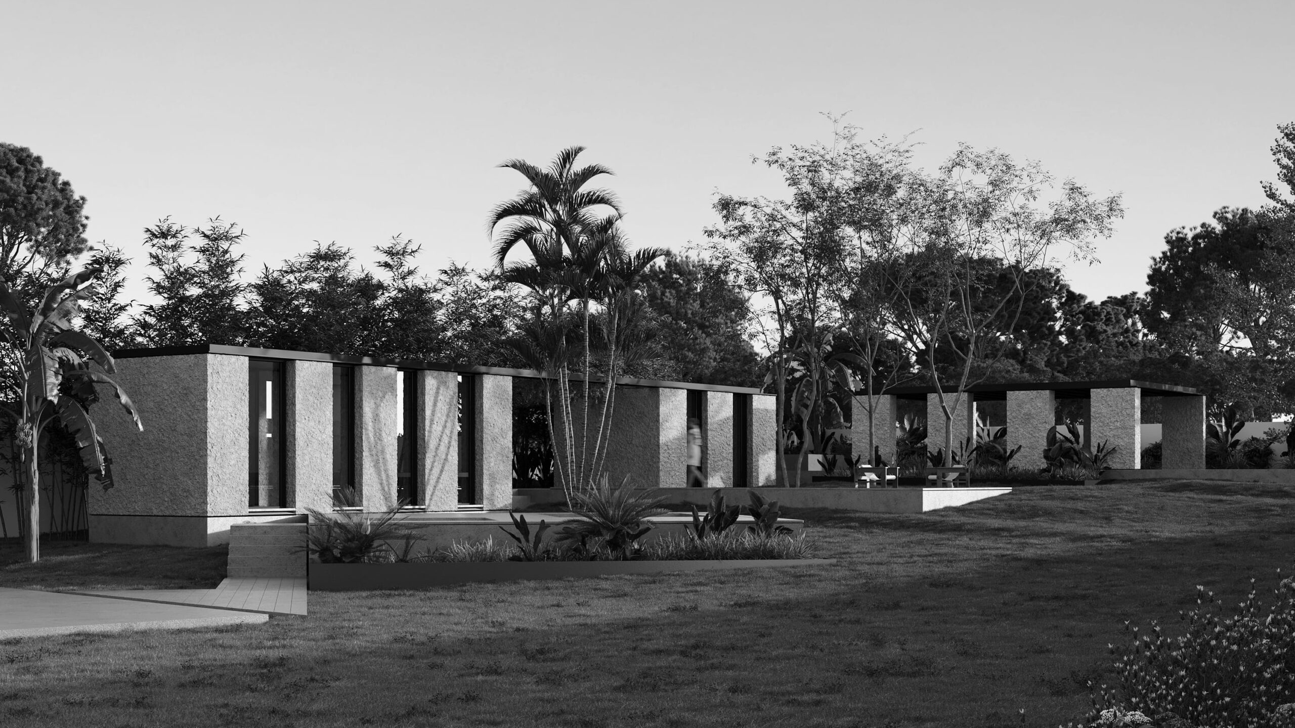 Los pabellones, al igual que la pérgola, se materializan como un sistema murario de hormigón. Mediante una solución artesanal de carpintería de acero diseñada desde morenomuñoz, es posible hacer desaparecer todos los planos de vidrio de los pabellones. De esa manera, tanto las piezas de servicio como la pérgola se perciben como construcciones con carácter, aunque permeables, como unos macizos de piedra que permiten las vistas cruzadas entre sí.