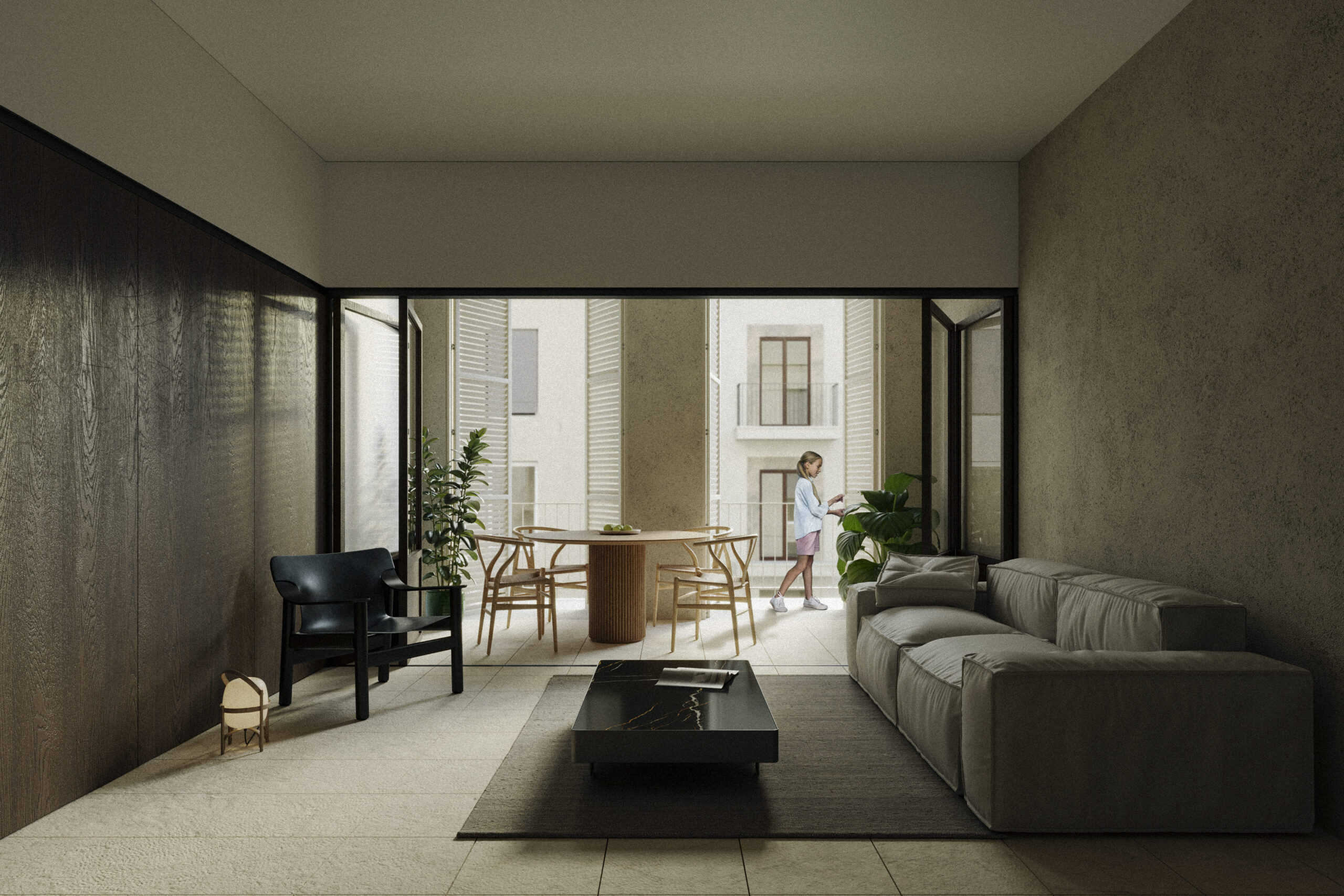 Pese a tratarse de un entorno urbano consolidado, la ausencia de espacio público de calidad y próximo, obliga al proyecto a generar un espacio en planta baja con vocación pública. Se dispone, de manera secuencial, dos espacios seguidos aunque claramente diferenciados. Un primer espacio de recepción y cafetería, abierto a todos los vecinos del barrio y a los huéspedes del hotel; seguido de un vestíbulo común conectado al patio interior. Este segundo, con un carácter más privado, se acompaña de un solárium y de una piscina para el descanso de los visitantes.