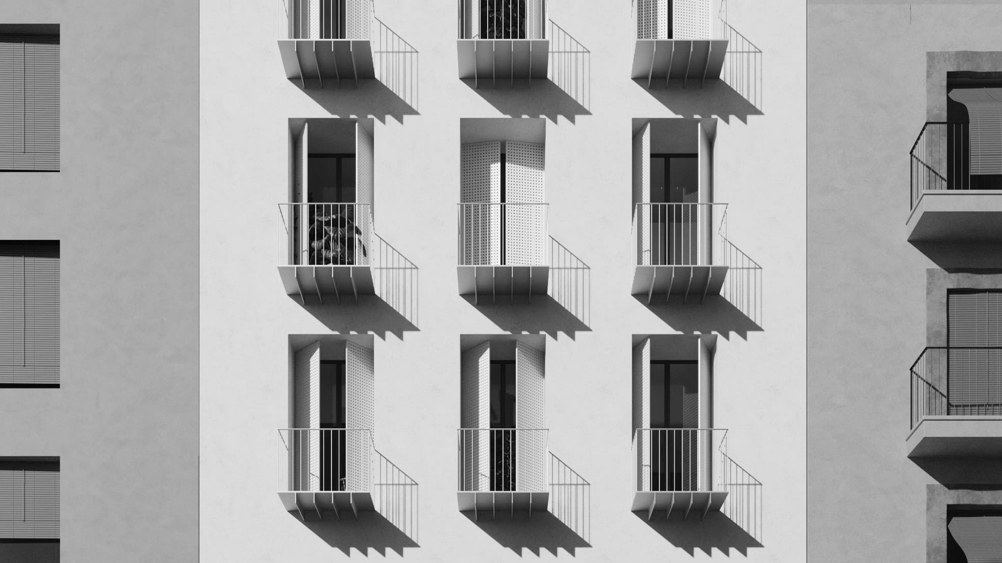 Se propone la construcción de un muro, una banda espesa en todo el perímetro de la parcela que permite generar unas terrazas de gran tamaño, tanto en relación con la vía principal como con el gran patio que capta la luz del oeste. El espesor de este muro permite concentrar, en los planos de fachada, los espacios de cocina, almacenaje e instalaciones. En los muros de medianera, el desdoble aglutina las escaleras y el ascensor. De esta manera, es posible liberar el resto de los espacios interiores y concebirlo como todo un gran ámbito polivalente.