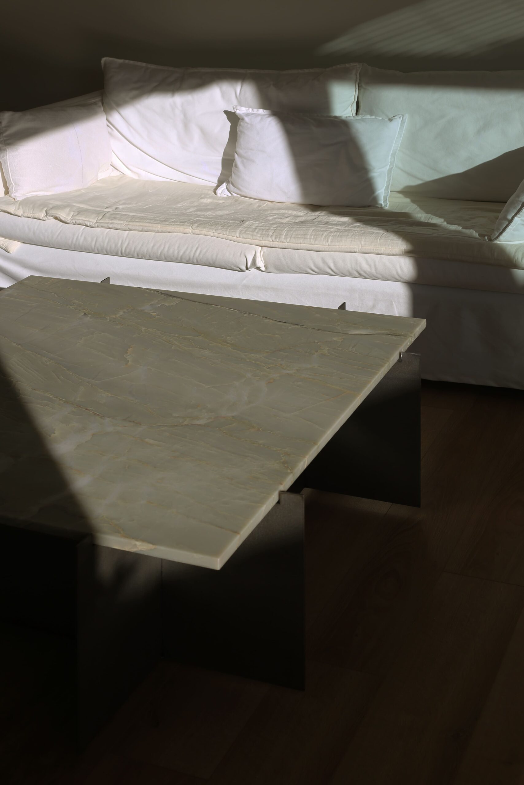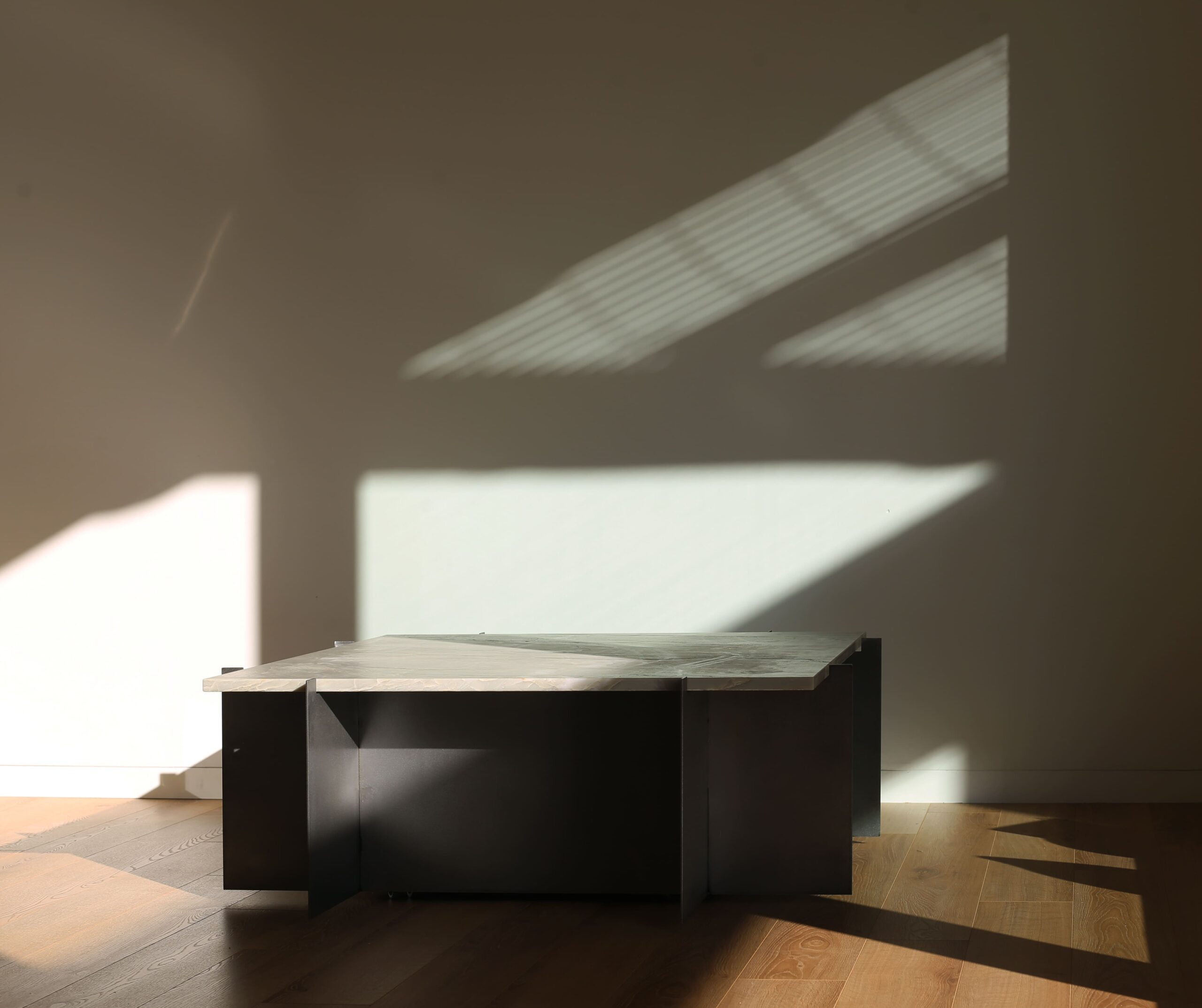 OBJETO 002 nace de la voluntad de aprovechar el excedente de piedra natural empleado en la cocina de CASA 004. Se proyecta una estructura formada por cuatro planos de acero, machihembrados, pulidos y lacados para evitar su corrosión. Se refuerza la estructura interiormente con un bastidor que, además, incorpora unas ruedas para su fácil desplazamiento. Los planos se rematan con unos salientes superiores que delimitan el espacio para el sobre de piedra, como el engarzado de un anillo.